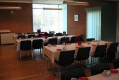 I salen er der mulighed for opdækning ved runde borde (Ø160/8 personer) og firkantede borde (180 cm/6personer).
